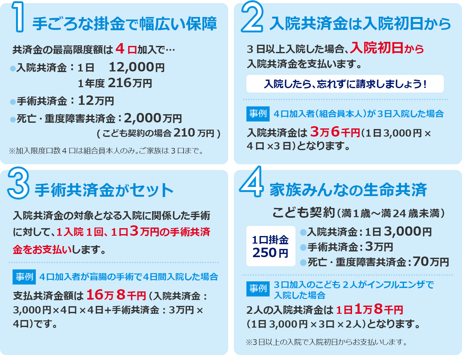 3日以上入院 1日目から支払 1口3,000円/日 (3口9,000円/日) (4口12,000円/日) 1共済期間 (7月1日~6月30日) で 最大180日分 1口最高54万円 (3口最高162万円) (4口最高216万円)  |