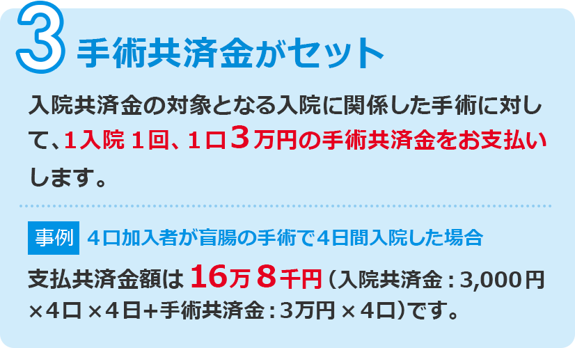 入院共済金の 支払対象となる入院に関係した手術 1入院につき1回 1口3万円 (3口9万円) (4口12万円)  |